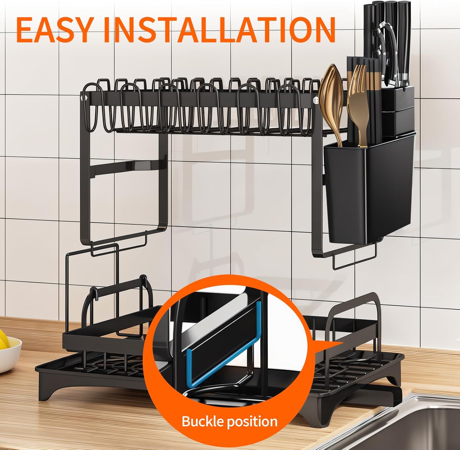Easy to Install: This 2-tier metal dish drain rack is easy to install and can be easily assembled and disassembled without any tools. The thickened bracket has strong load-bearing capacity and a stable structure that is not easy to shake or deform.