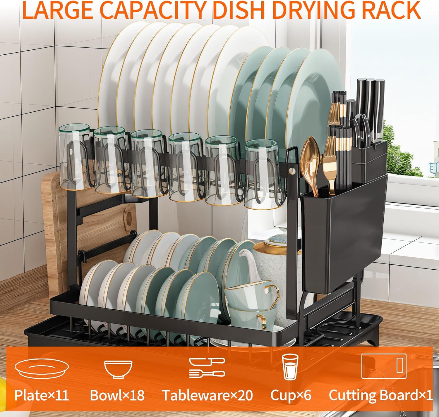 - Large-capacity Storage: The dish drainer rack has 2 layers of drain racks, which can store about 11 dishes and 18 bowls. There are cutlery racks and cup racks on both sides of the dish drying rack, which can also be used to store forks and spoons, place cups and cutting boards.